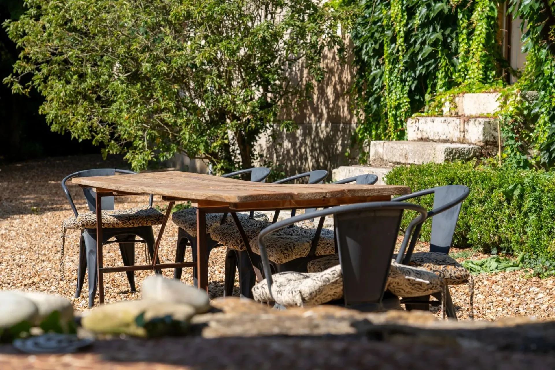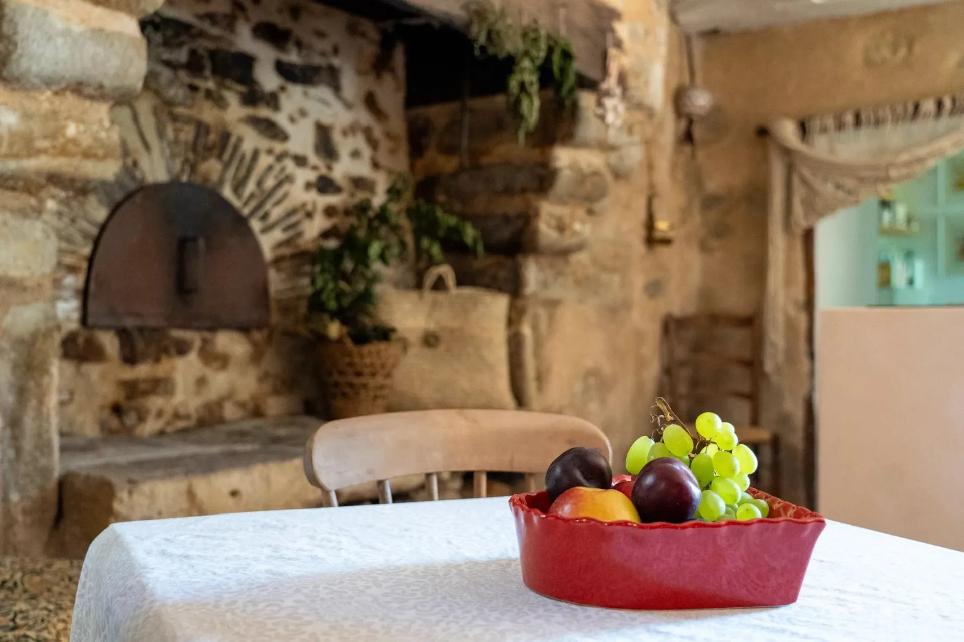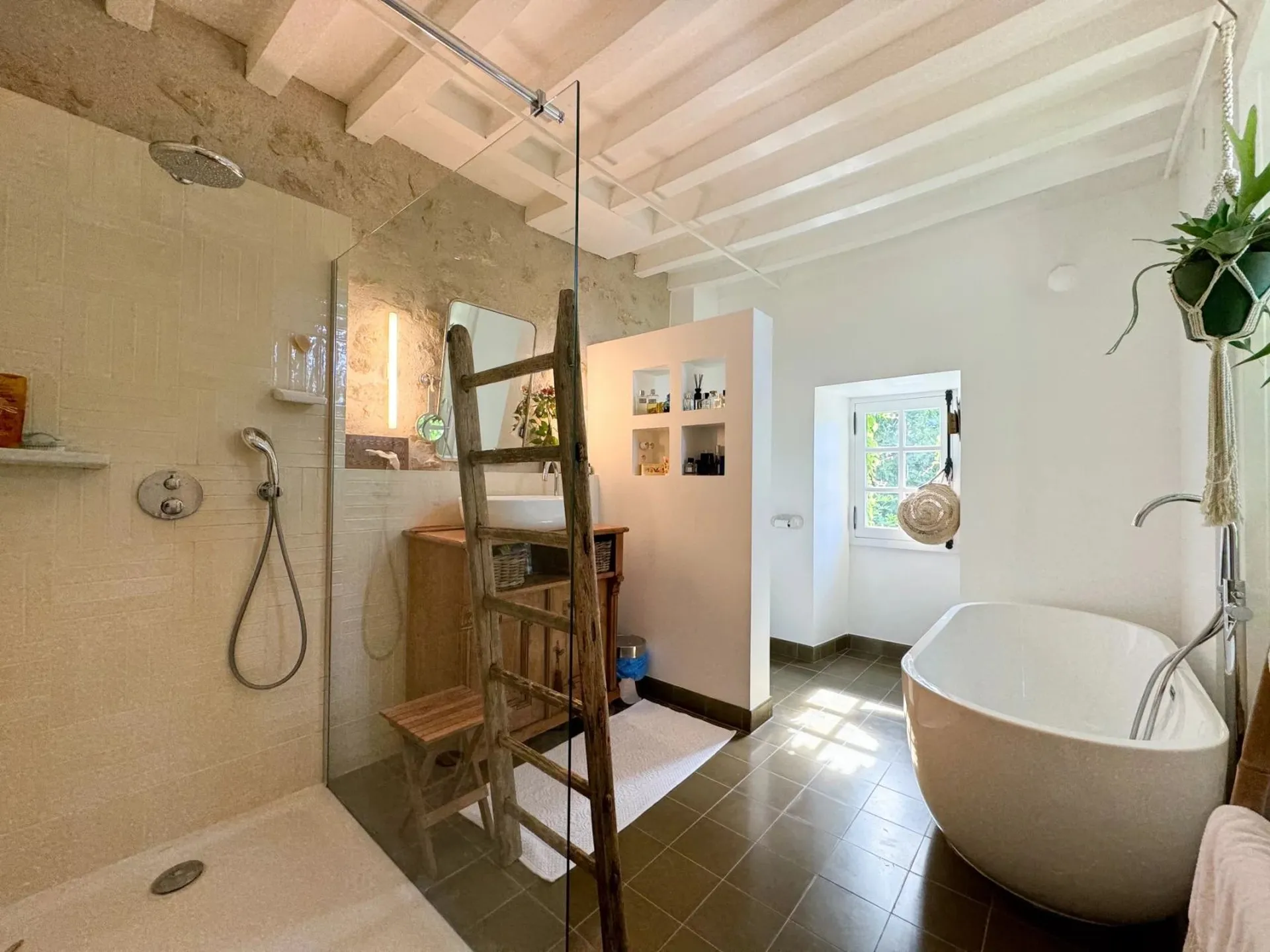L'authenticité a été préservée grâce aux tomettes anciennes, aux pierres d'origine, aux cheminées conservées et aux poutres apparentes qui créent un décor chaleureux.