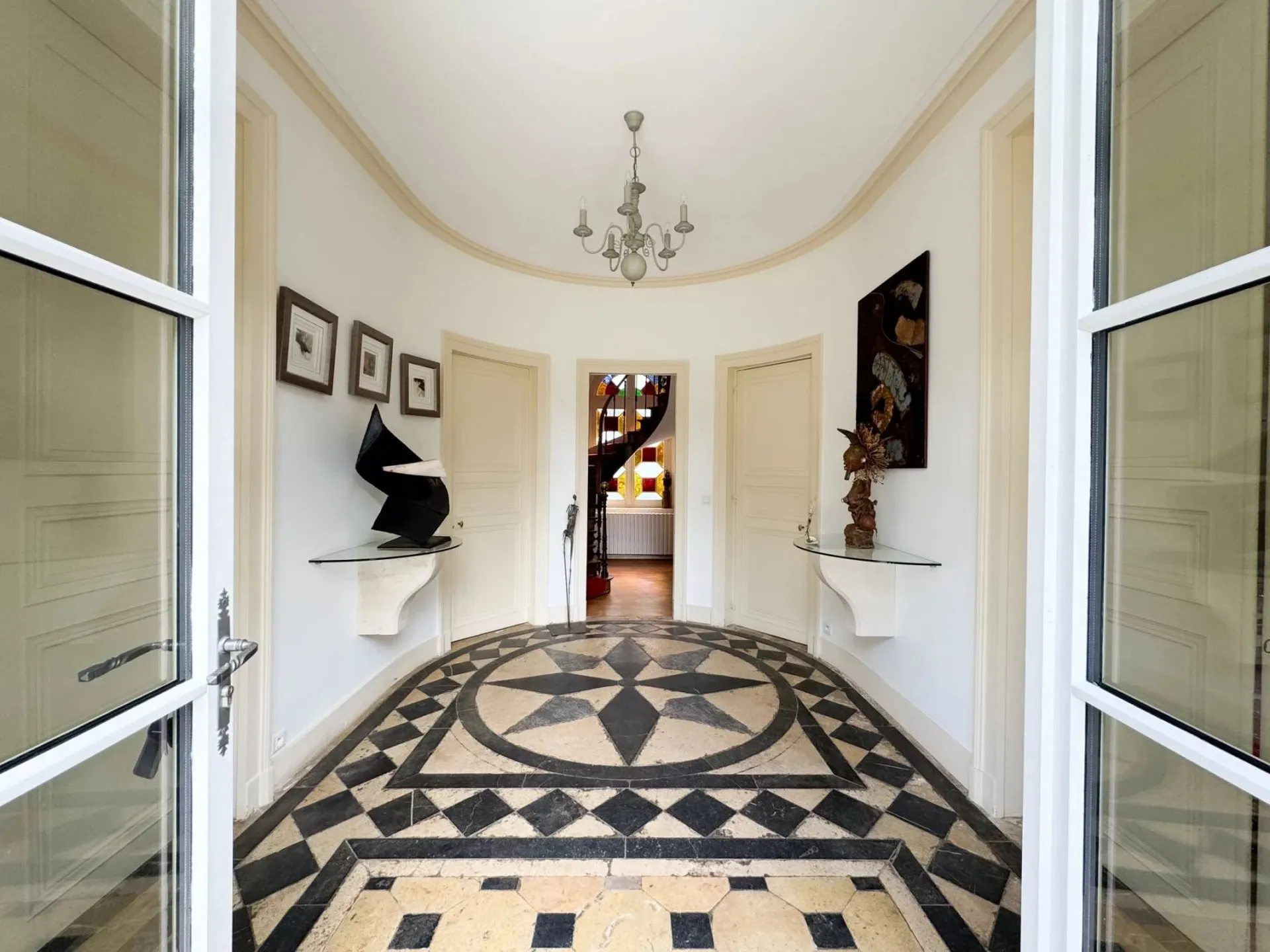 Le manoir présente une façade classique et s'ouvre sur une élégante entrée en rotonde ornée d'un sol en marqueterie de marbre noir et blanc.