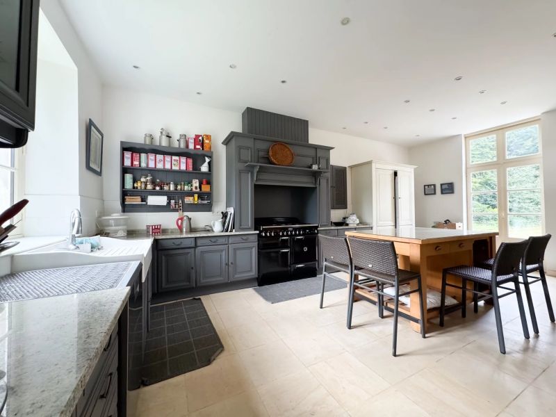La salle à manger ouvre sur une vaste cuisine dinatoire, équipée pour répondre à tous vos besoins culinaires. Une arrière-cuisine complète cet espace fonctionnel.