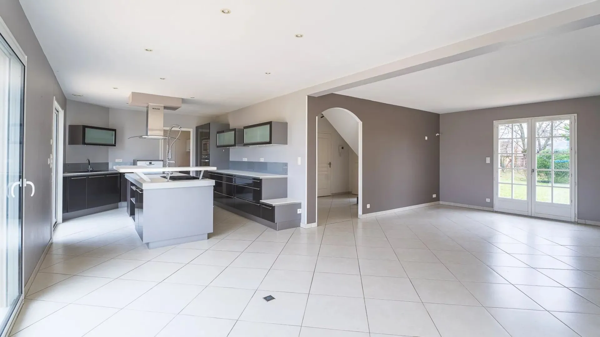 Le cœur de la maison, inondé de lumière naturelle, se compose d'un salon ouvert sur une cuisine moderne et équipée, d'une vaste arrière-cuisine et d'une buanderie.