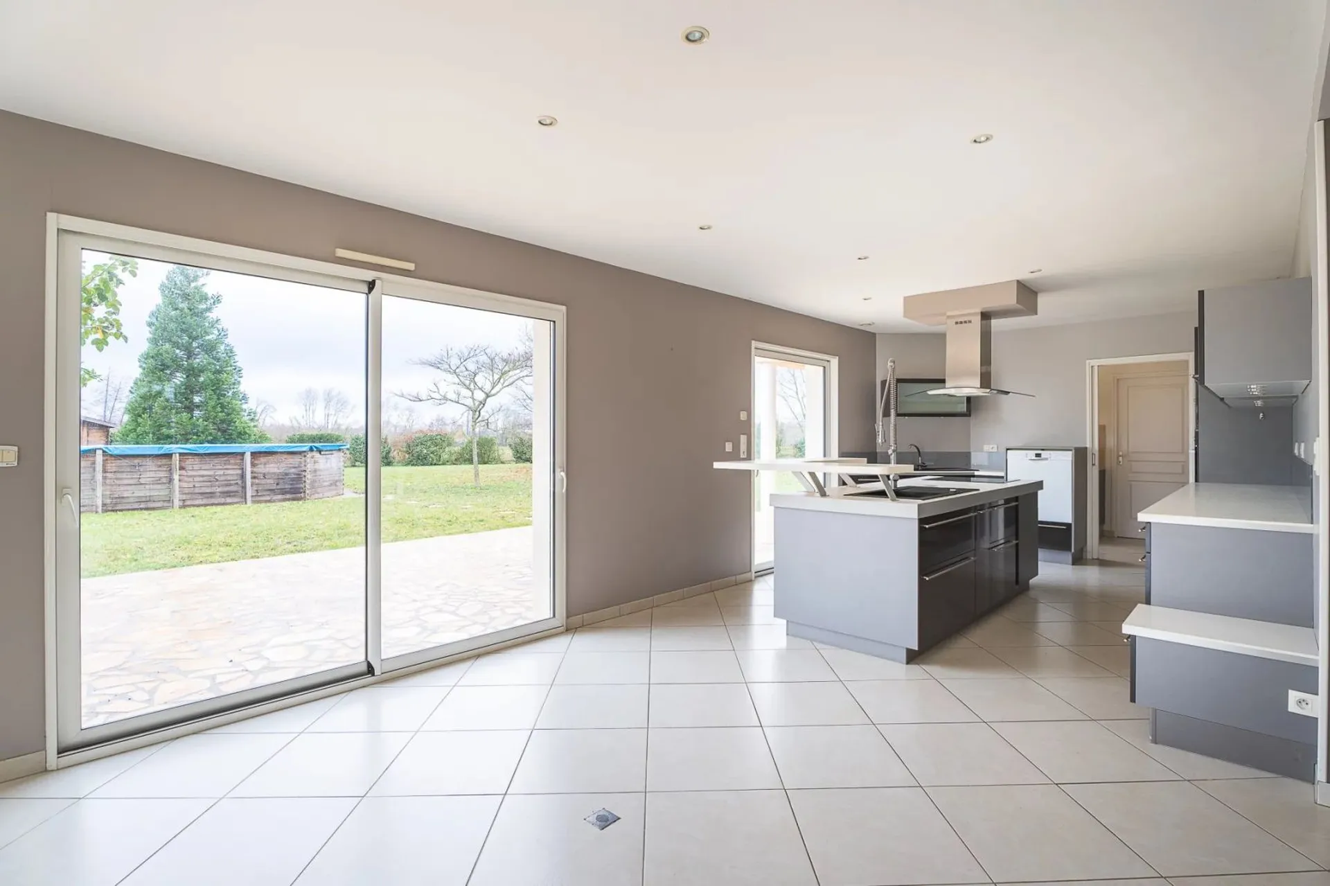 Les larges baies vitrées offrent une vue panoramique sur le jardin paysager et la piscine, complétant harmonieusement l'extérieur de la propriété.